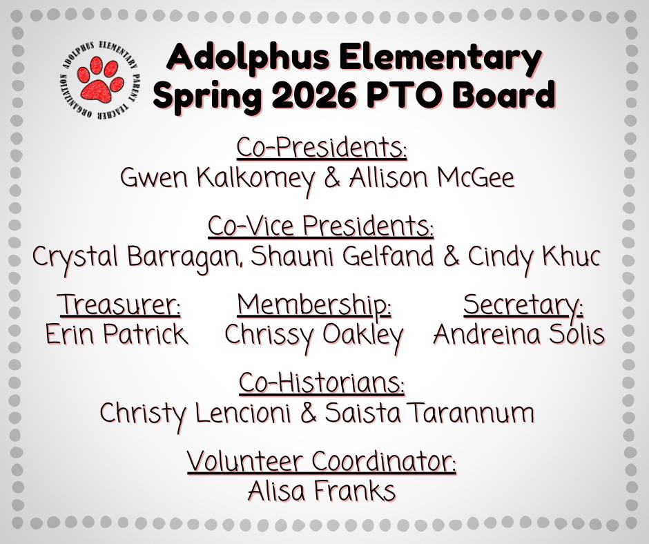 - Treasurer - Erin Patrick (treasurer@adolphuspto.org)